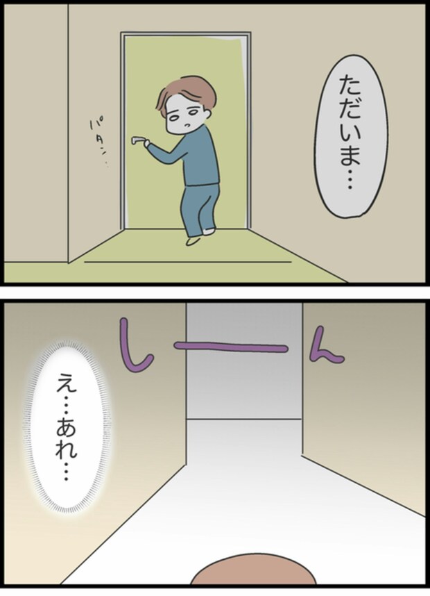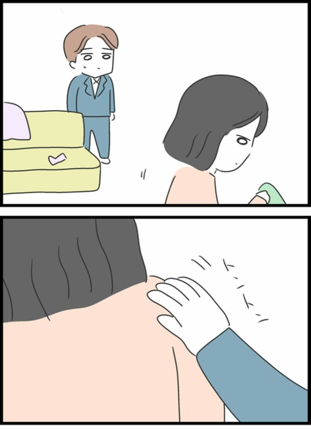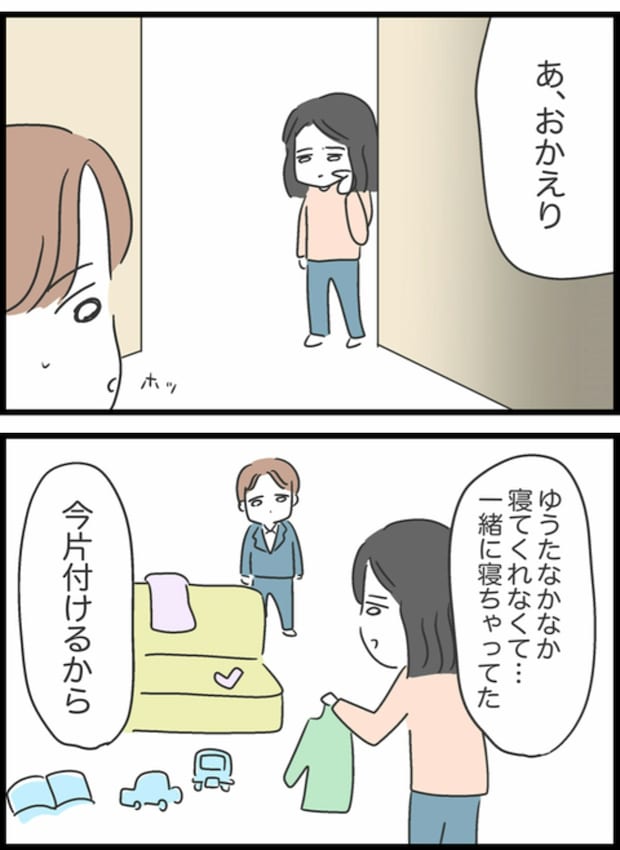 しょうたが家に帰ると息子ゆうたを寝かしつけたようこが起きてきました。お部屋は荒れたまま…。ようこが片づけようとすると…?外で頭を冷やしてきたしょうたが、ある行動をとります。