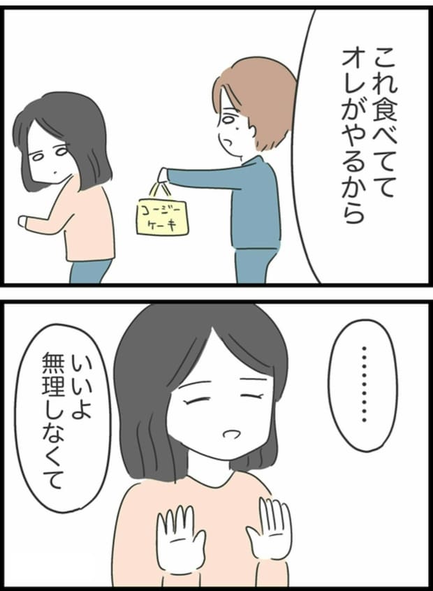 帰宅後「ゆうたと一緒に寝落ちしてた」とようこが起きてきました。急いで片づけをしようとすると「これ食べてて、オレがやるから」としょうたがお土産のケーキを渡し…。