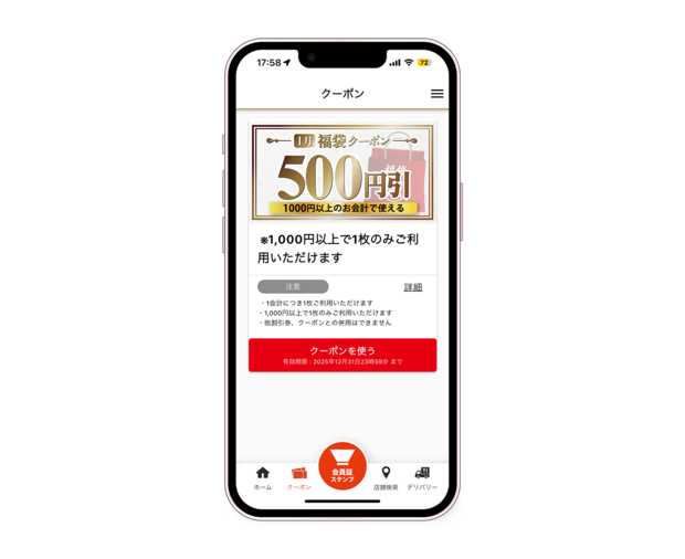 クーポンは税込1,000円以上の会計で1枚使用可能。使用期間はそれぞれ異なり、2026年1月から3月まで毎月1枚ずつ利用できますよ。