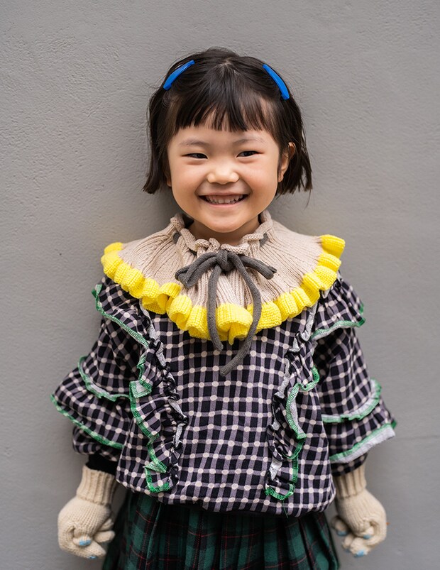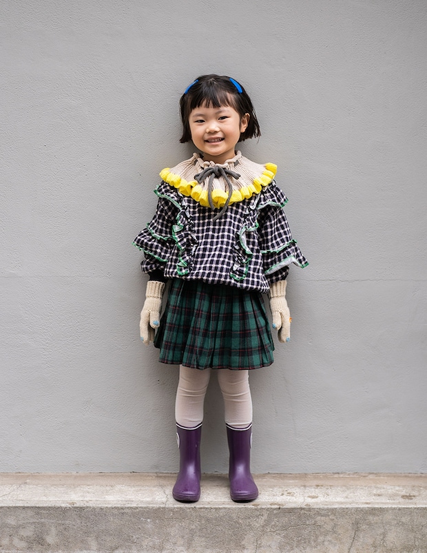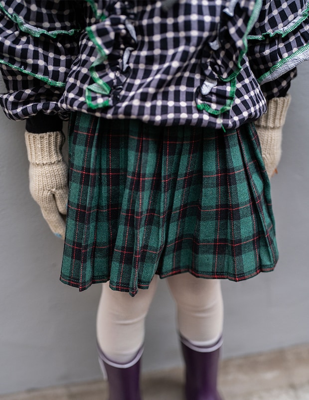 kids’s voice襟がいちばんお気に入り。チェックスカートと緑色も!