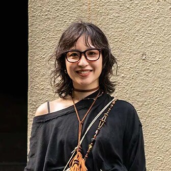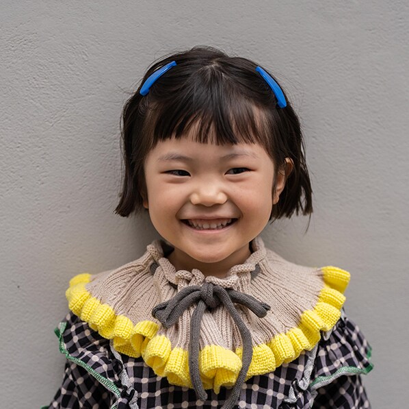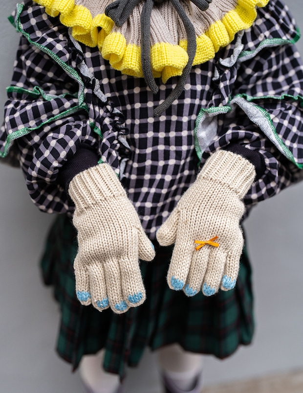 チェック柄合わせを華麗に着こなすはなちゃん♡ ビッグカラーのイエローが全体のアクセントに! マニキュアがついた手袋も遊び心たっぷり。
