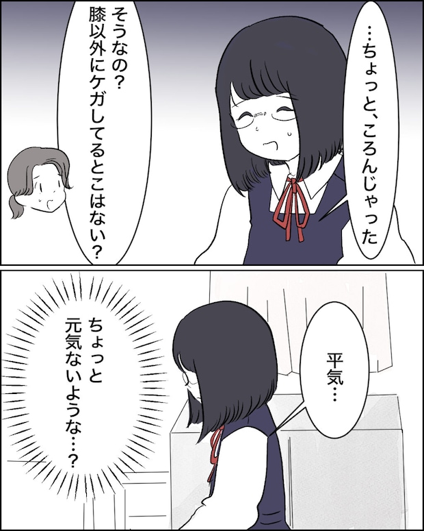 私の顔を見ると、歩実は急いで笑顔を作って「ちょっと転んじゃった」と言いました。運動は苦手な方で、すこしぼんやりしたところもある歩実なので、その時の私は「そうなの?ほかにケガはない?」と、歩実の言葉をそのまま受け取っていたのでした。それでも「平気。」と言いながら部屋へ行く歩実の様子が少し元気がないように見えました。
