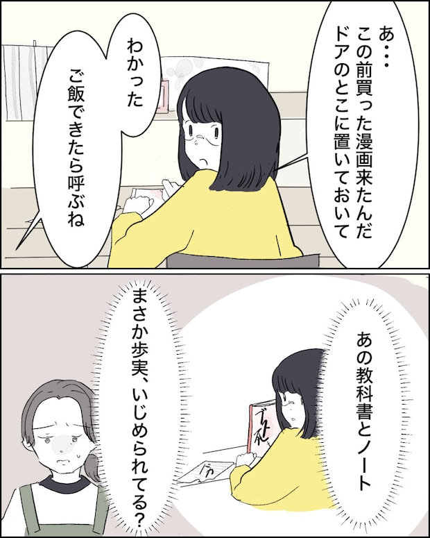 それでも歩実は「この前買ったマンガ届いたんだ」と、荷物はドアのところに置いてほしいと平静を装って私に言いました。そばに近寄ってほしくないのね、と私は悟りました。なぜなら私は見てしまったのです。歩実が急いで隠したノートに、黒いペンで悪口が書かれていたのを。しかも、大きい字でいくつも。まさか歩実、イジメられているの?と私は胸が張り裂けそうでした。