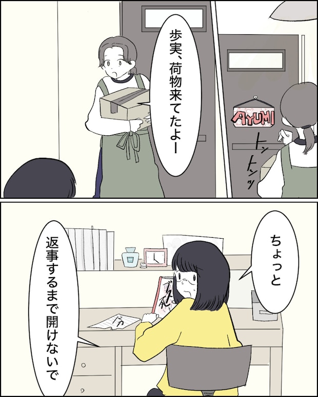 歩実宛に届いた荷物を持って部屋に行くと、いつもなら宿題か読書をしている歩実は何も言いませんが、なぜかこの日は私が歩実の部屋のドアをノックすると同時に開けて入ると、机に向かっていた歩実は急に慌ててノートや教科書を片付けながら「ちょっと、返事するまで開けないで」と言いました。