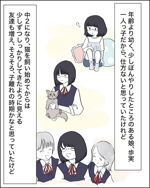 娘の歩実は小さいころからおとなしい性格で、お友達と一緒に遊ぶよりは一人で本を読んでぼんやりと空想にふけったりするのが好きなので、友達にも自分から積極的には話しかけるタイプではありません。周りの子に比べて幼い感じのする歩実でしたが、猫を飼って世話を任せるようになってからは少ししっかりしてきたように見えるし、中学生になってからは気の合うお友達もできたようなので、そろそろ親離れの時期かなと思っていたそんなころでした。