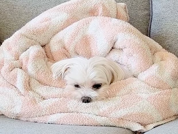 飼い主さんに毛布をかけてもらうと、