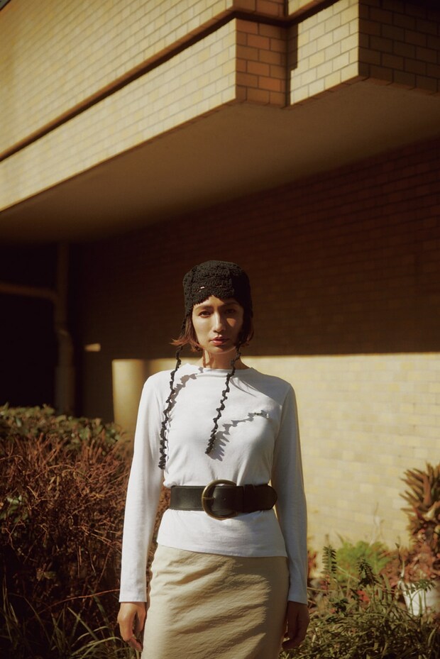 ベルト¥16,000(バナナ・リパブリック)、トップス¥14,300(アニエス ベー プール アダム エ ロペ/アダム エ ロペ)、スカート¥28,600(ヨー ビオトープ)、帽子¥22,000(パーバーズ/エドストローム オフィス)