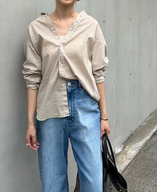 「ナチュラルなバンドカラーシャツと淡色デニムで柔らかい雰囲気を。シンプルなワンツーコーデなので柄のバッグと眼鏡、ゴールドのジュエリーなをでアクセントを加えました。シャツは襟を抜いたり袖をたくし上げたりと、少し着崩しながらこなれた印象を心掛けています」