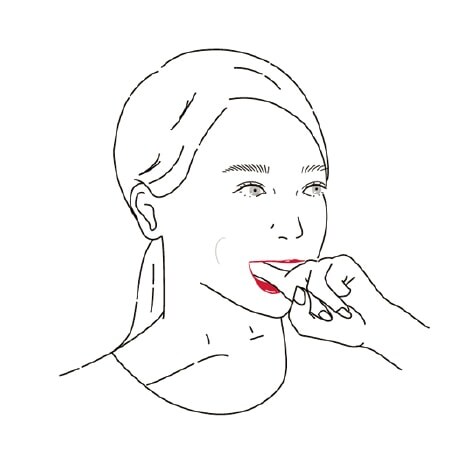 人さし指を口の中に入れ、指のハラで咬筋(エラの部分)を内側からグッと押す(5秒~10秒間)。▶︎ストレスによる食いしばりなどで、こわばりがちな咬筋を緩め、エラのハリの軽減に。