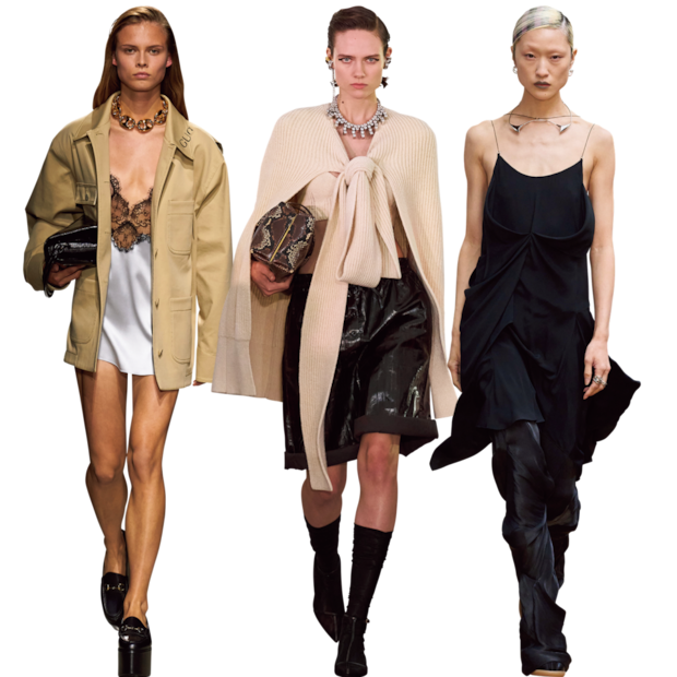 コーディネートの鍵を握るジュエリーも、見過ごせない今シーズン。なかでもクワイエットラグジュアリーが牽引するベーシック旋風に彩りを加えるような、コスチュームジュエリー級のボリューミーなネックレスがランウェイを席巻。
