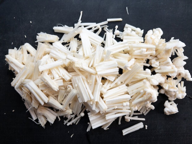 ① えのき茸は石づきを落とし、2cm幅にカットします。付け根のくっついたえのき茸は、ほぐしておきます。