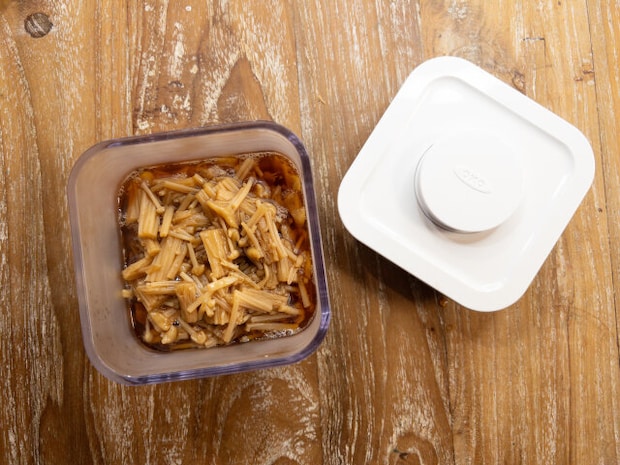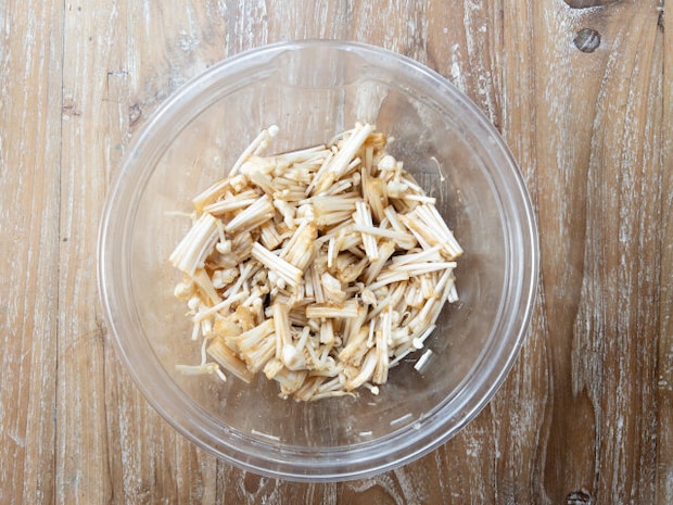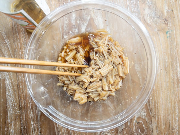 ② 耐熱ボウルに①のえのき茸、◎の調味料を入れて全体にまぶし、ふんわりラップをかけて、600Wのレンジで7分加熱します。