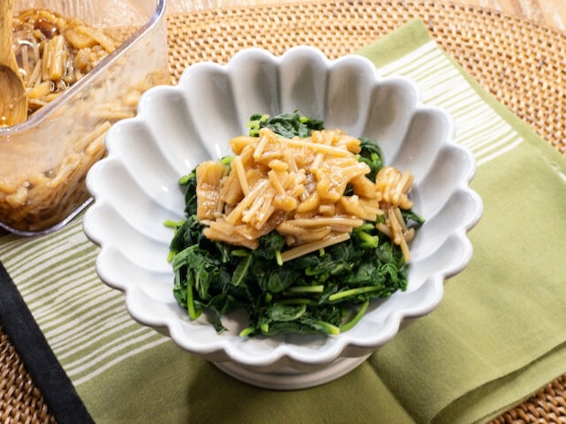 こちらは茹でたモロヘイヤになめ茸をかけたものです。青菜は他に、ほうれん草・小松菜・ニラなどとも相性が良いですよ。