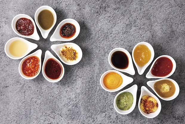 餃子1品の注文ごとにたれを選べるスタイルで、鉄ラー油の入った定番の「元祖たれ」、「チーズソース」、「出汁ジュレ」など14種類を用意。「シャキシャキわさび」や「ジンジャーセサミ」といった、インバウンド客を見据えた和風たれもラインアップしている。餃子とたれの組み合わせは、128通りにも及ぶという。