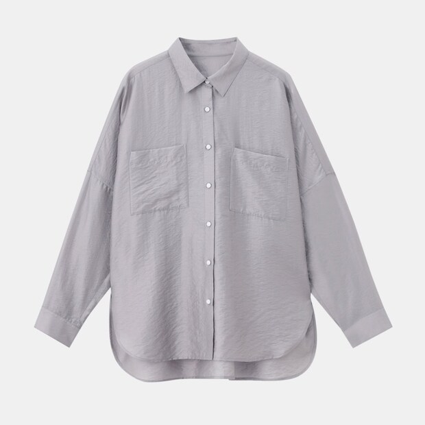 「シャツはシアー感が強過ぎず、絶妙な透け具合が気に入っています。ドルマンスリーブになっていてゆとりがあるので、今回のようにトップスとしても、羽織りとしてオーバーに着ても様になります」シャツ¥7,990(プラステ)