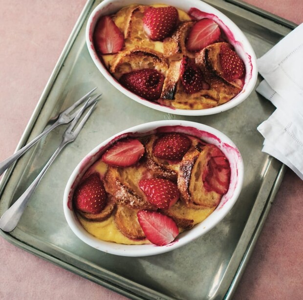 ③ 耐熱容器に❷のバゲットを先に敷き詰め、残りの卵液を流し入れる。いちごをのせてグラニュー糖を全体に薄くふり、オーブントーター(1000W)でこんがりと焼き色がつくまで15分ほど焼く。