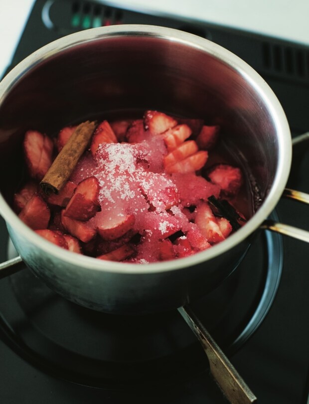 いちごは小さく切ると、短時間でとろとろのソースが作れる。アクを除くと色みが鮮やかになり、雑味のないスッキリとした味に。