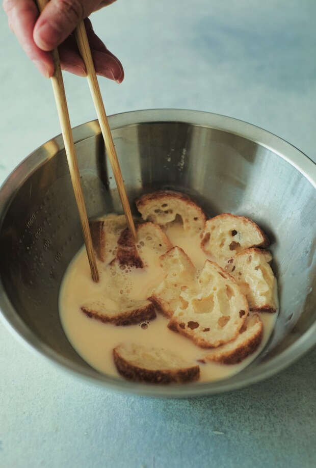 バゲットを菜箸で沈めながら浸し、卵液をしっかり吸わせてしっとりさせることが大事。バゲットと卵液の一体感が増し、おいしさもアップ。