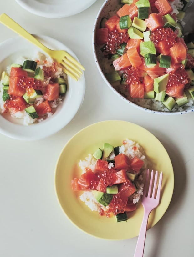 濃厚なサーモンとアボカドで、大満足の食べごたえに。具材は大きめの角切りにすると、作りやすく食べやすい!