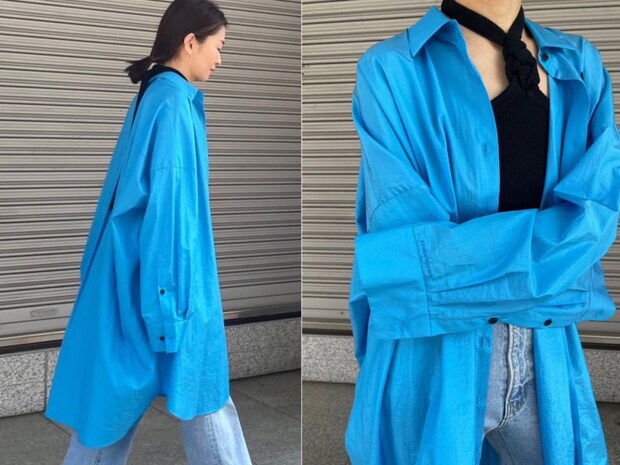 「軽やかな素材感と光沢感が魅力の色鮮やかなビッグシャツ。季節に合わせて羽織としてコーディネートしてみました。中に重ねたホルターネックニットは締め色としてブラックをチョイスし、女性らしい雰囲気も加えました。今季らしいキレイなブルーは1枚で存在感抜群です」