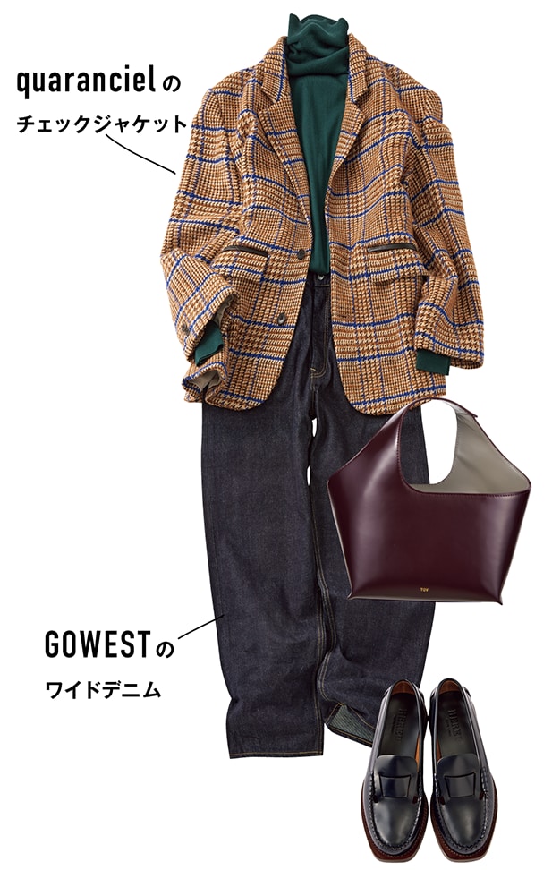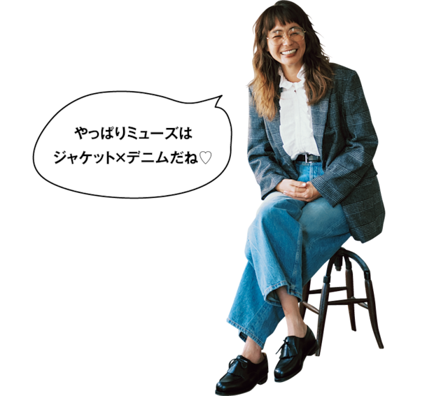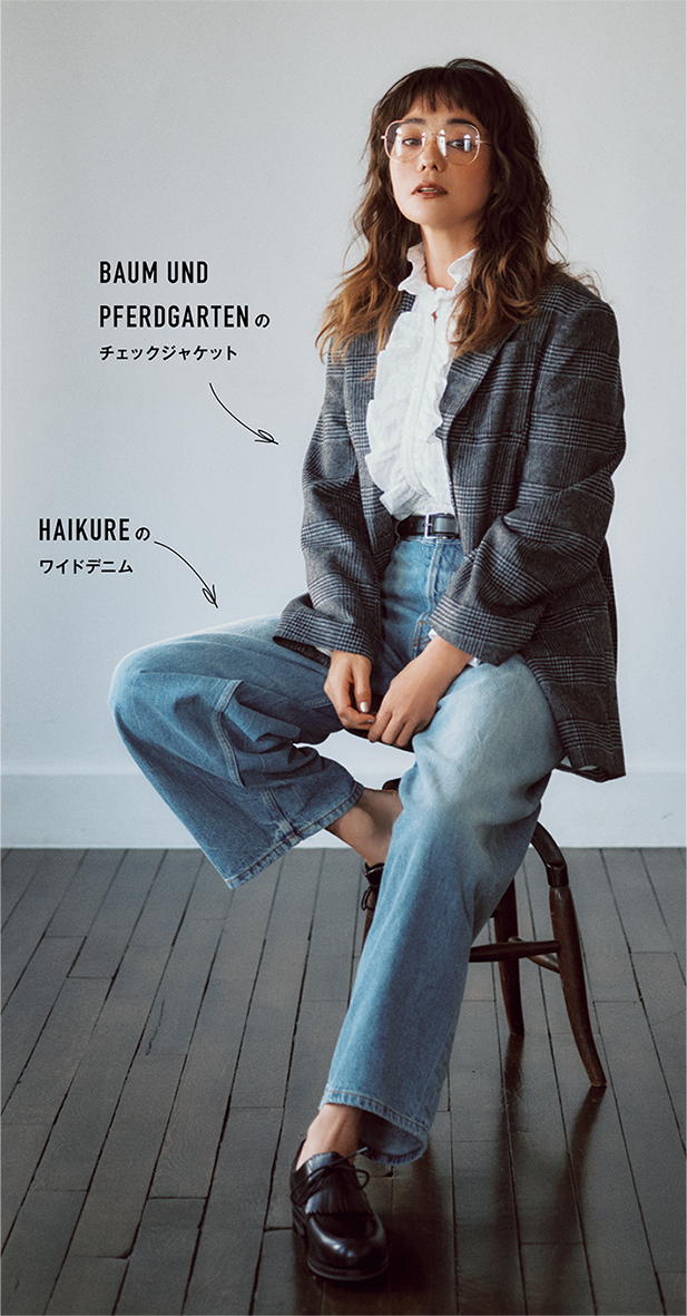 チェック柄がトラッドムード満載のジャケットは、今季らしいワイドデニムで旬のバランスに。オーバーサイズのジャケットでハンサムな雰囲気を保ちつつも、フリルブラウスで絶妙な甘さをプラスするのがミューズ流。カジュアルになり過ぎないよう、眼鏡やローファー、ベルトできちんと感を演出するのもポイント。