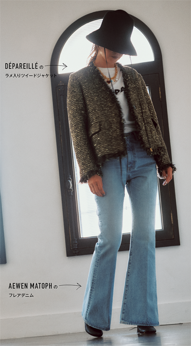 ゴールドラメやフリンジのトリミングがゴージャスなツイードジャケットは1枚で主役級の華やかさ。だからこそ、ロゴT×デニムのシンプルな組み合わせがちょうどいい。デニムはフレアをチョイスしてどこか70年代ムードに。