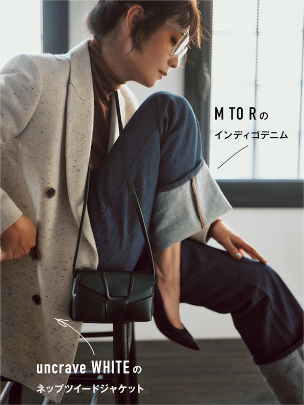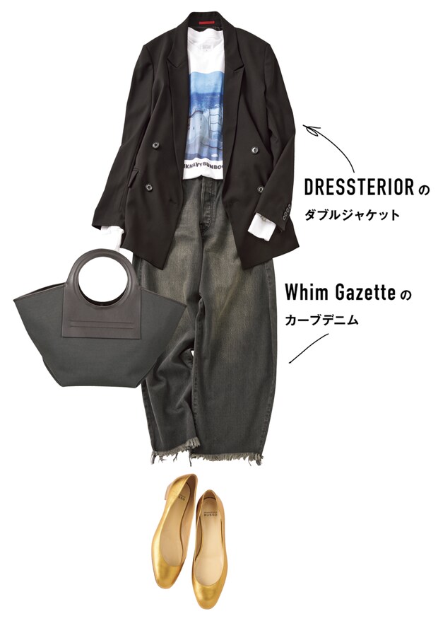 ジャケット¥37,400(ドレステリア/ドレステリア 渋谷スクランブルスクエア店)、デニムパンツ¥30,800(ウィム ガゼット/ウィム ガゼット ルミネ新宿店)、ロングTシャツ¥9,350(タンタン/アダム エ ロペ)、バッグ¥64,900(ヘリュー/ショールーム セッション)、パンプス¥97,900(フランチェスコ ルッソ/ロンハーマン)