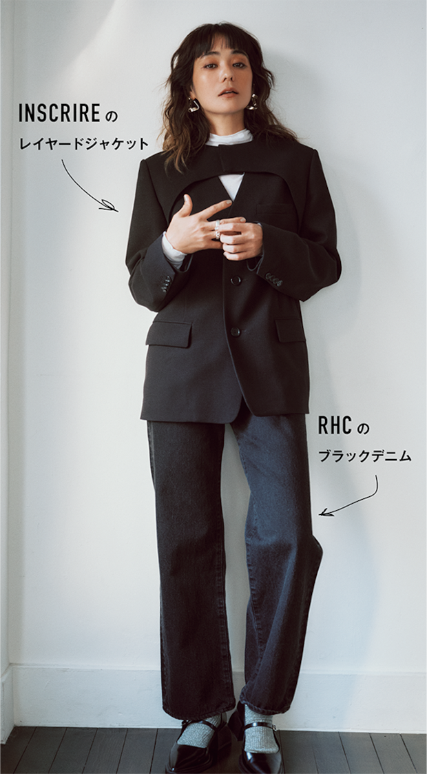 レイヤードジャケット¥107,800(アンスクリア/アマン)、デニムパンツ¥25,300(RHC/RHC ロンハーマン)、トップス¥12,100(エイチ ビューティ&ユース)、ピアス¥44,000、ダブルリング¥33,000(共にブランイリス/ブランイリス トーキョー)、ソックス¥3,300(ブルー フォレ/ロンハーマン)、パンプス¥29,150(ヴァガボンド/オデット エ オディール 新宿店)