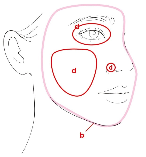 まずbのピンク下地を顔全体に薄く伸ばす。さらに頰の逆三角ゾーンを中心にdのファンデをスポンジでタッピングするように塗り、スポンジに残ったぶんで目まわりや小鼻をカバーする。