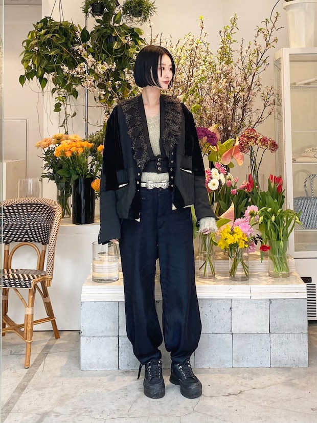 MASUのジャケットとパンツ、THEATRE PRODUCTSのフリルベストとニット、OAO のシューズは本人私物
