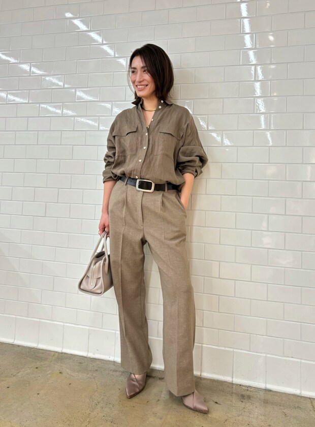 リネンが涼やかなシャツスタイルはモカのワントーンで大人ムードに。「あえてモカのワントーンでまとめて、今季らしくサファリムードを感じるスタイリングに。シンプルなコーディネートですが首元の開け方や袖など、ヌケ感の出る着こなしを意識しています」