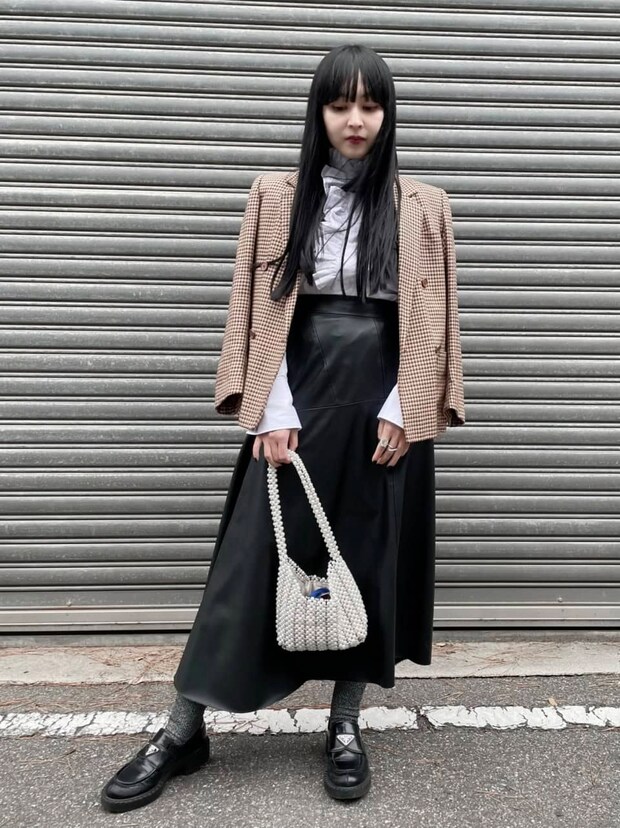 シックなトラッドスタイルにフリルシャツでひと匙の甘さを。「ハイ&ローで作るトラッドコーデ。スタイリングのバランスやショー会場とは対照的に落ち着いた色使いなど、Dior 24SSのコレクションが個人的にドストライクで、リアルクローズとして落とし込んでみました」