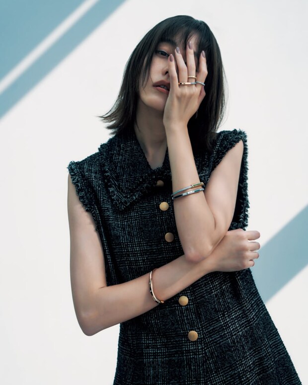 左腕上から:〈ティファニー ロック〉バングル[K18YG×K18WG×DIA]¥2,255,000、同 [K18WG×DIA]¥2,365,000、右腕:同 [K18RG×DIA]¥1,606,000(全てティファニー/ティファニー・アンド カンパニー・ジャパン・インク)、ジレ¥66,000(コラム/エストネーション)