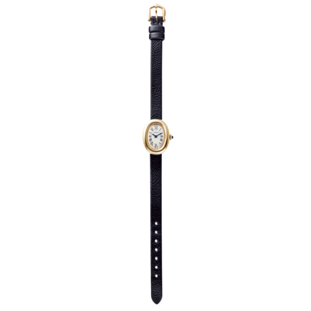 【モデル着用】ミニマルな黒ベルトが気分。〈ベニュワール〉ウオッチ[YG×カーフスキン]¥1,174,800(カルティエ/カルティエ カスタマー サービスセンター)