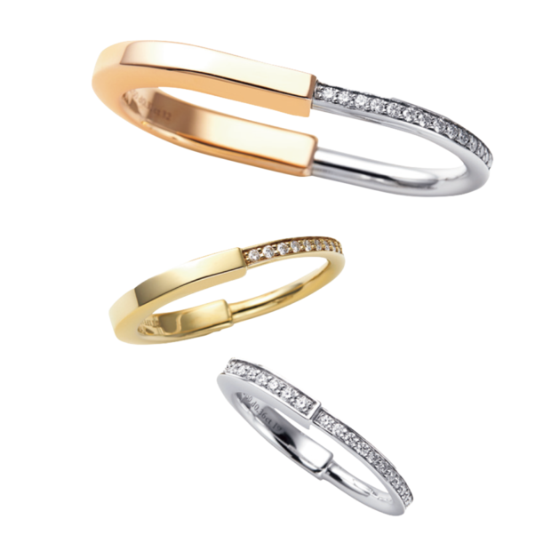 【モデル着用】大切な絆やつながりをイメージ。中指~薬指:〈ティファニー ロック〉2フィンガーリング[K18RG×K18WG×DIA]¥1,232,000、中指:同リング[K18YG×DIA]¥522,500、人さし指:同リング[K18WG×DIA]¥896,500(全てティファニー/ティファニー・アンド カンパニー・ジャパン・インク)