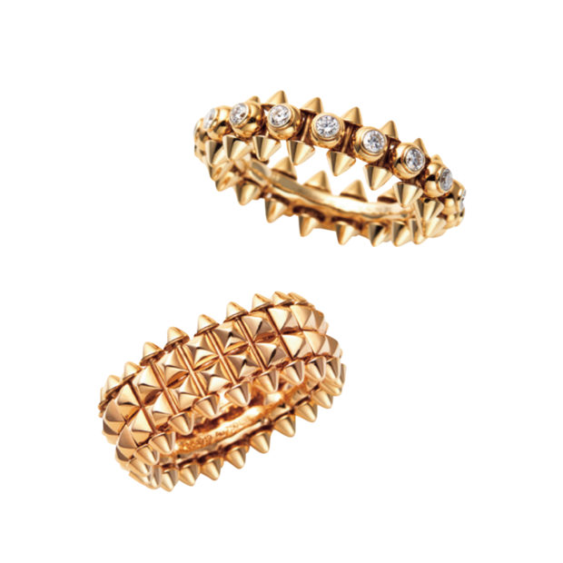 【モデル着用】既存の枠組みから脱し、新たな領域へ! そんな思いを後押しする、凜としたデザインを。上:〈クラッシュ ドゥ カルティエ〉リング[PG×DIA]¥1,452,000、下:同 リング[PG]¥643,500(全てカルティエ/カルティエ カスタマー サービスセンター)