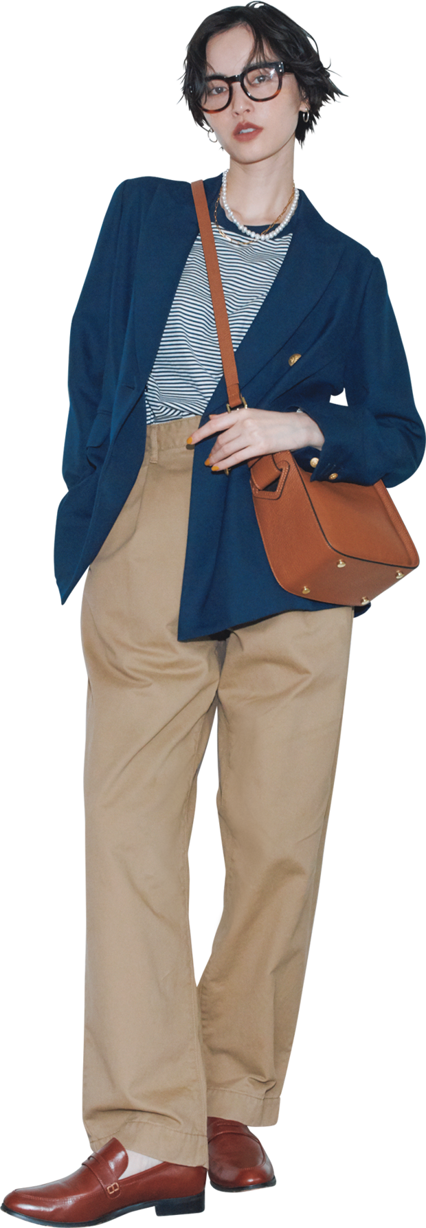 誰が何と言おうと様になる、紺ブレ×チノのザ・アメトラスタイル。ボーダートップスはウエストをインしてコンパクトに、さらにパールネックレスを合わせて女性らしさを匂わせるのが大人の流儀。ブラウンレザーのショルダーバッグとローファーを合わせればさらに完璧!