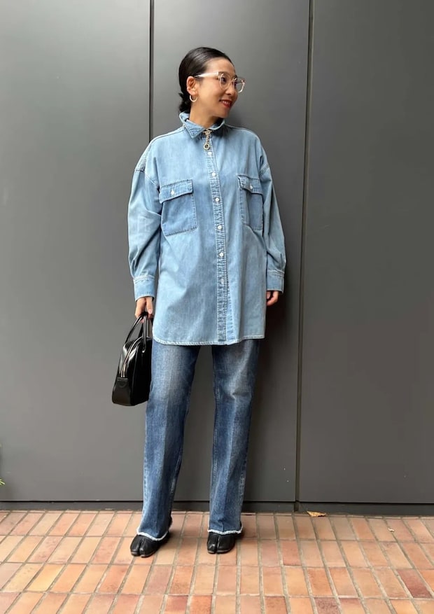 オールデニムながらどこかモードを感じる着こなしは小物使いが肝。ブラックのレザーバッグ&シューズで引き締めつつ、ゴールドジュエリーやクリアフレームの眼鏡などソリッドな質感をきかせて。シャツのボタンをあえて上まで留めているのもニクイ♡