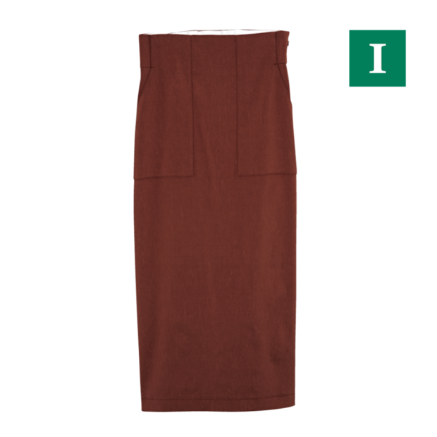 スタイルアップも叶えてくれるペンシルシルエットのスカートは、ストレッチ&バックスリット入りではきやすさも抜群。サラリとしたリネン混素材、テラコッタカラーが大人っぽい雰囲気。スカート¥19,800(ロペ)