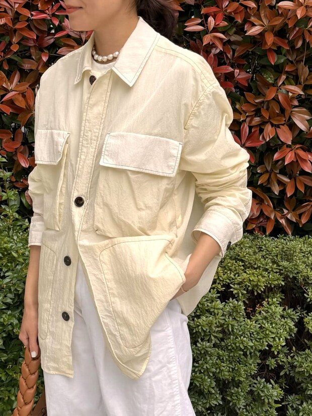 「ここ数年ハマっているオールホワイトのコーディネート。全体的に緩めのシルエットなので、ブラウンとブラックを差し色にして引き締めました。ほんのり透け感のあるオーバーサイズのシャツはマニッシュな印象なので、パールやバレエシューズを取り入れて女性らしさをプラスしました」