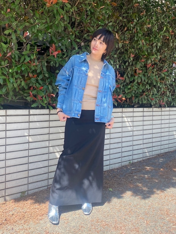 ビッグシルエットのデニムジャケットはロングスカートで女性らしい印象に。「デニムジャケットがカジュアルな印象なので、シアーニットや華奢なジュエリーを合わせて。足元にシルバーのブーツを差して自分らしいアクセントをプラスしました」