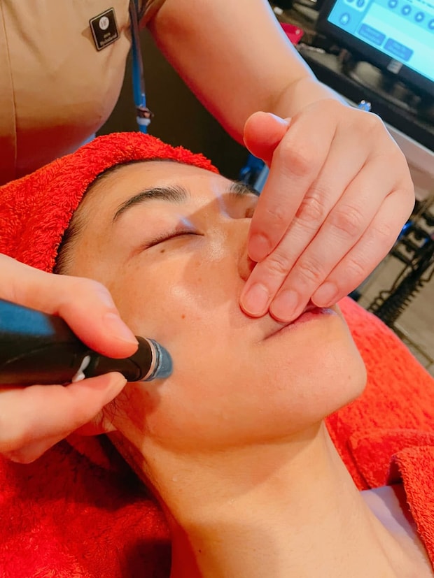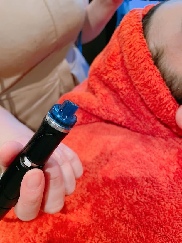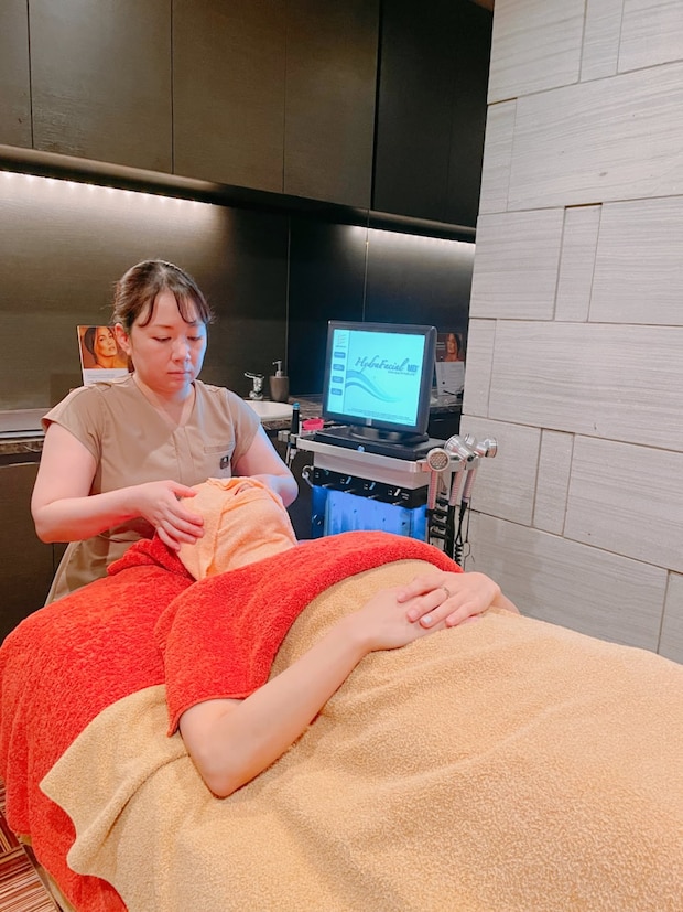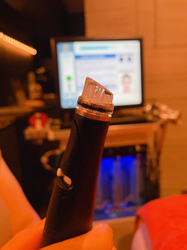 カウンセリングが終わったら、個室で着替えてハイドラフェイシャル施術のスタート! 乳酸で皮膚の皮脂と汚れを軟らかくし、特殊なチップで吸引していきます。私はとくに刺激を感じることはありませんでしたが、皮膚が薄い人は多少ピリッとした刺激があることもあるそう。