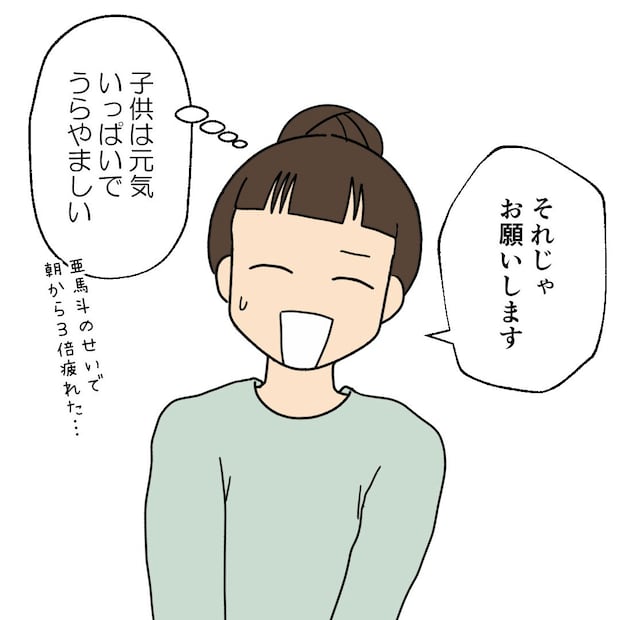 主にパパさんが送迎を担当しているお家もあるようで、多恵子とウル実は思わず「うらやましいな」とつぶやきます。