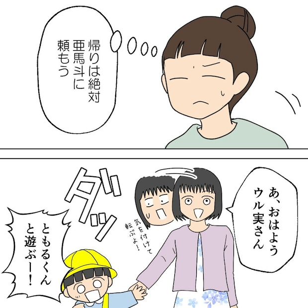 早くもお疲れ気味のウル実。そこへ、多恵子親子も登園してきます。2人は子どもを同じ保育園に通わせるママ友です。