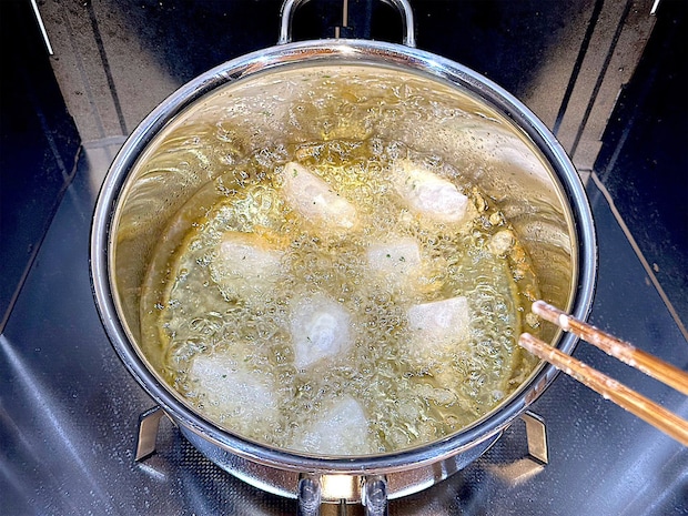 4. 3に粗熱を取った里芋を入れて衣をつけ、170度の油で1〜2分ほど揚げる。
