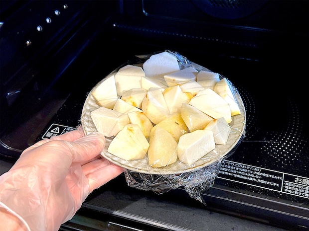 切るサイズにもよりますが、今回は600Wで3分30秒加熱しました。