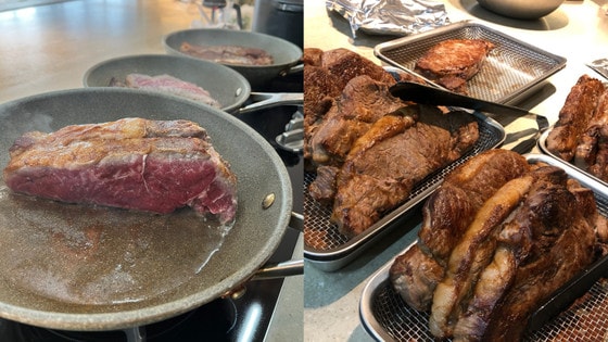 33センチはある分厚いステーキ肉を、次々と焼き上げていく——。 料理家でありオージー・ビーフPRアンバサダー日本代表も務める今井さんは、パーソナリティの小竹の声がけで、今年の3月にクックパッド社内で社員向けにステーキ教室を開催した。