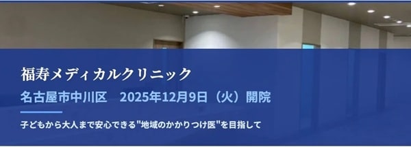 名古屋市中川区に12月9日(火)、「福寿メディカルクリニック」が開院した。同クリニックは、地域の人々の健康維持と子どもたちの成長を支える医療を提供していく。