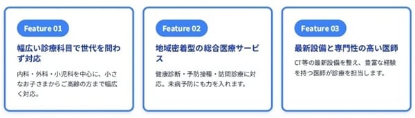 1つ目は、幅広い診療科目。内科・外科・小児科・消化器内科・肛門科など、全世代に対応する。2つ目は、地域密着型サービス。予防接種、健康診断、訪問診療にも対応し、未病予防に注力する。3つ目は、最新設備と専門医。CT等の最新医療設備を完備し、豊富な経験を持つ医師が診療する。4つ目は、教育機関との連携。保育園・幼稚園と協力し、子どもの健康と発育を継続的に支援する。