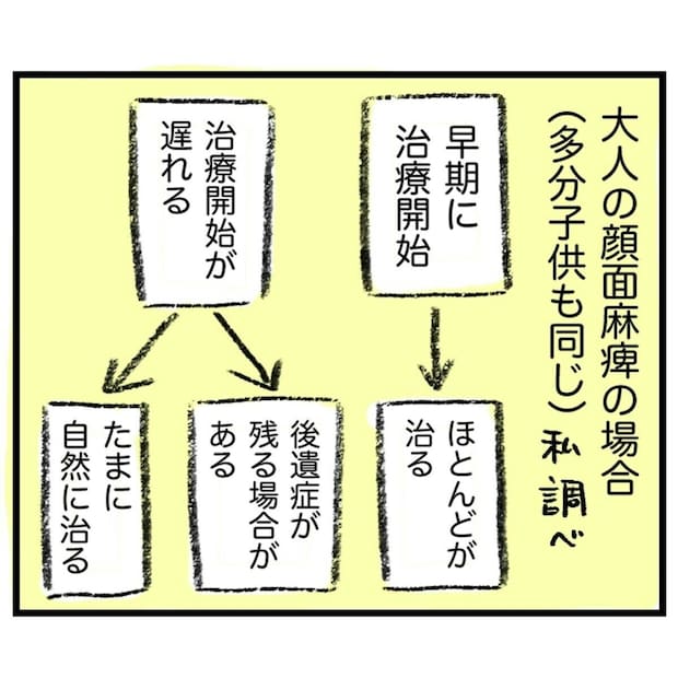 ある朝、娘に起こされたなかきはらさん。しかしその娘ちゃんの顔を見ると、半分だけ引きつっていたのです。「早く治療しないと」との一心で病院を受診すると、総合病院での診察をすすめられます。